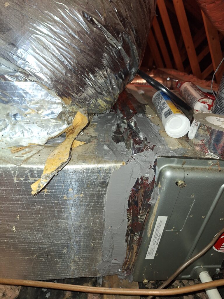 On the supply end, we did what we could to tape and mastic the junction, while alerting the homeowner that both of these repairs were beyond the scope of this free program.