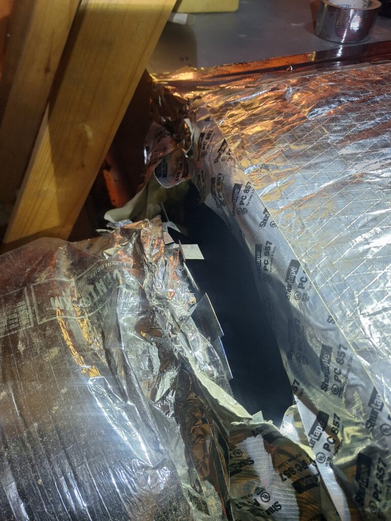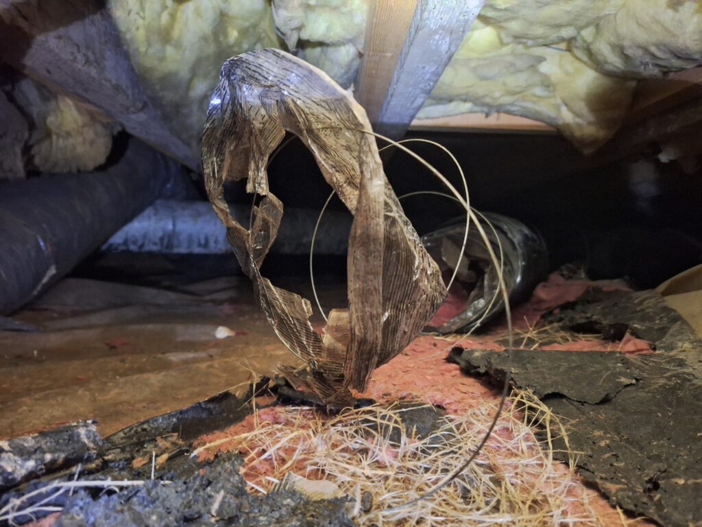 Two ducts in the crawlspace were victims of either cats, raccoons, or perhaps orcs. It was hard to gather what type of calamity befell them, as all that was left of these once proud ducts was a deflated pile of mangled wire.