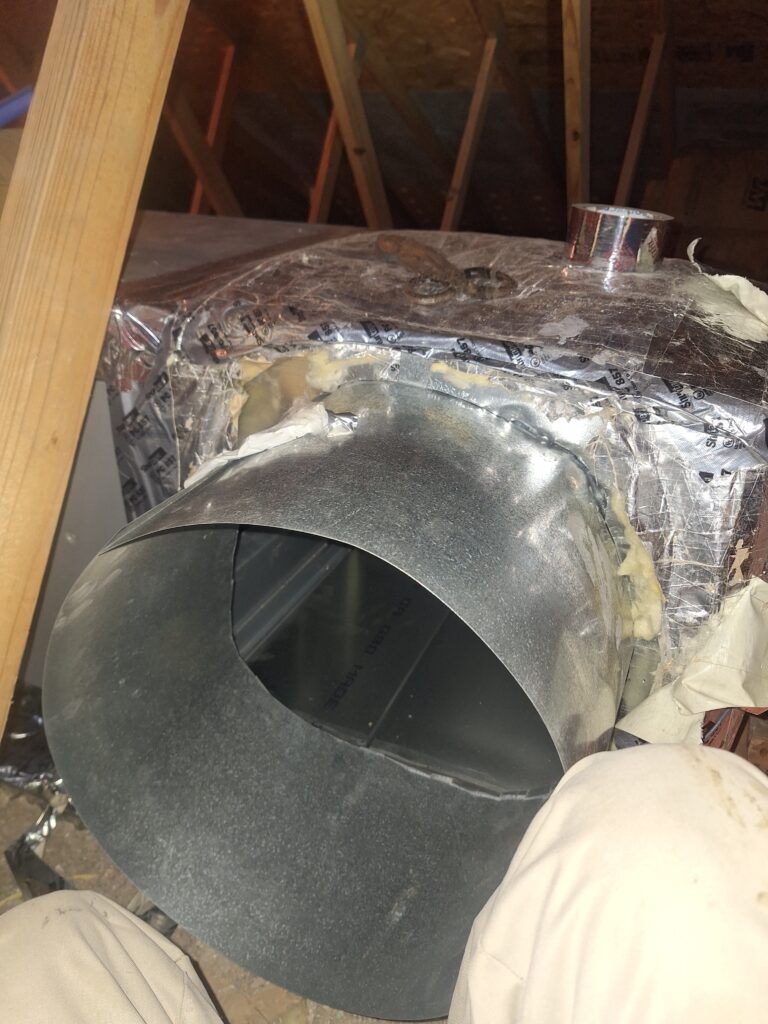 When we went to reconnect the return to the air handler, we realized that the hole was actually never large enough to fit the duct. So, we left the attic, found some tin snips in the element, and return to widen the hole. At the end, we spread mastic inside and outside of the return joint.